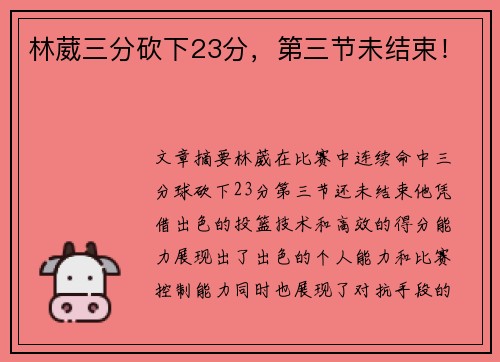 文章摘要:林葳在比赛中连续命中三分球,砍下23分,第三节还未结束。他凭借出色的投篮技术和高效的得分能力,展现出了出色的个人能力和比赛控制能力;同时也展现了对抗手段的多样性和应变能力。这场表现骄人的比赛,让人对他的未来发展充满期待。